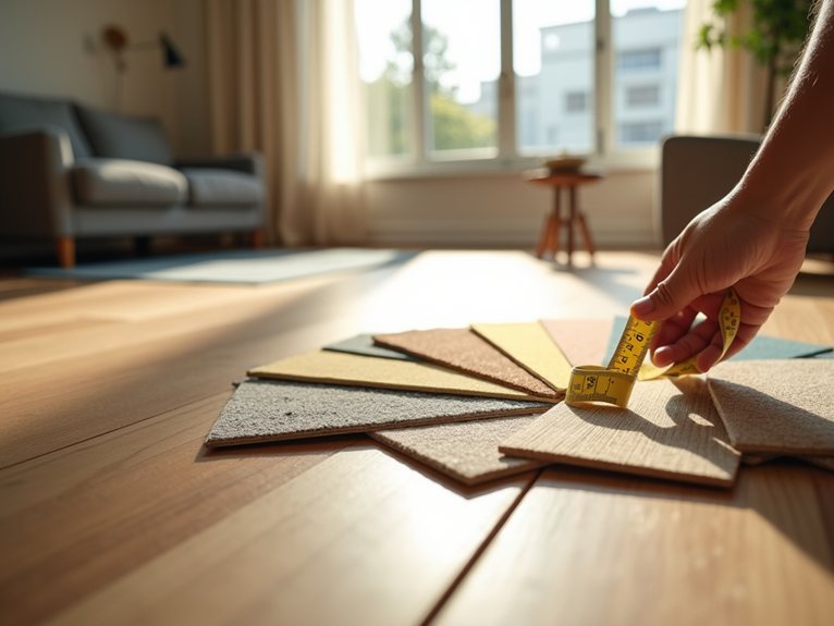 Beyond material selection, understanding flooring costs helps you plan a realistic budget for your home renovation. You’ll need to account for materials ($2-15 per square foot), underlayment ($0.50-1.50 per square foot), and professional installation ($3-8 per square foot). Don’t forget supplementary expenses like permit fees, which vary by municipality but typically range from $200-500.